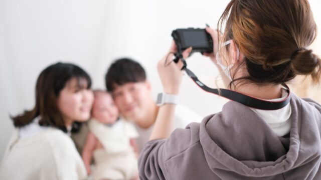 ご自身の持ち込みのカメラにて撮影していただけます。ご希望やお子様のご機嫌に合わせて撮影小物の配置及びお子様の目線誘導等のお手伝いをいたします。